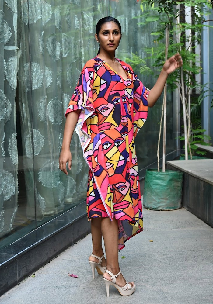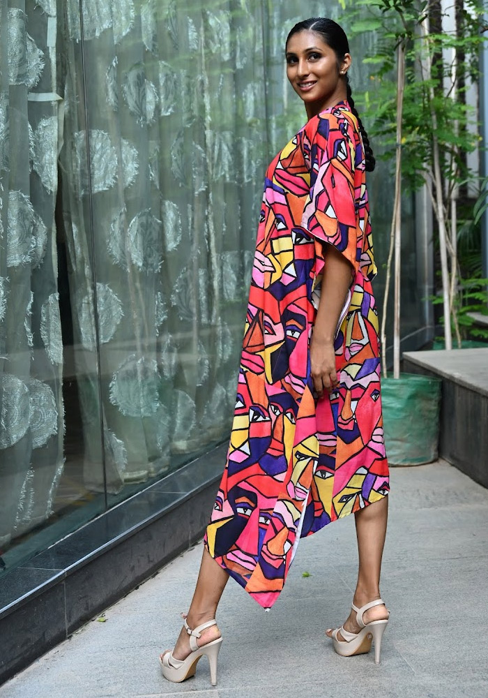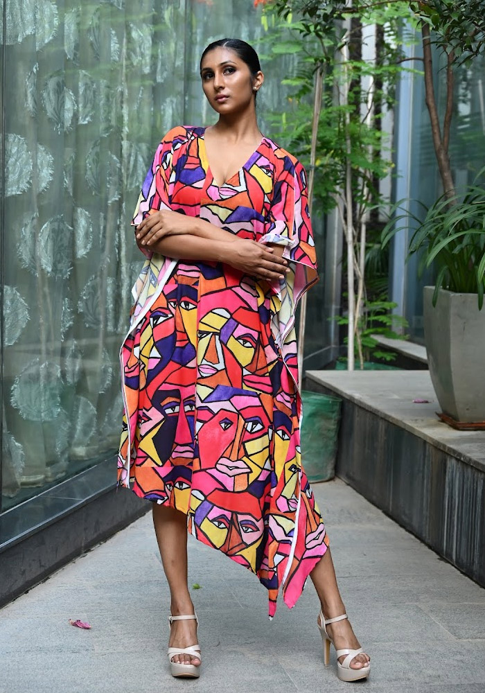 Make a statement with this exquisite Cubism art Kaftan, inspired by the legendary Pablo Picasso and designed by the renowned Kalki Subramaniam. This stunning piece of art is printed on soft, luxurious poly georgette satin fabric, creating a truly unique and captivating garment. The dominant pink hue adds a touch of femininity and glamour, while the intricate watercolor art work brings a sense of sophistication and elegance.