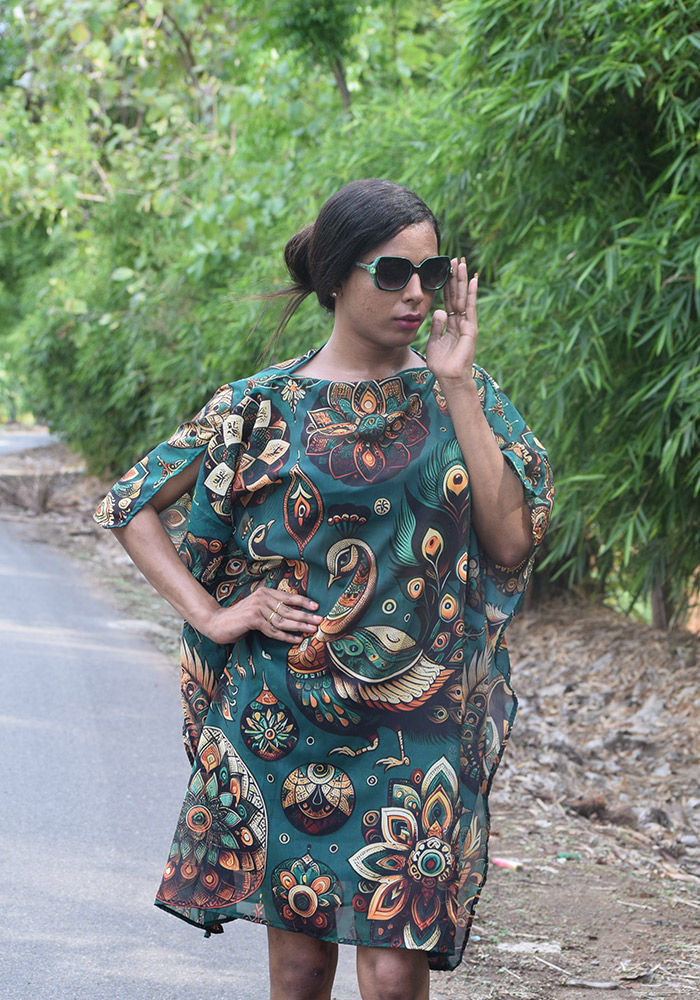 The vibrant, dark green hue serves as a magnificent backdrop, allowing the majestic birds to take center stage. The result is a stylish, elegant, and regal look that’s sure to turn heads. Perfect for festive occasions, special events, or simply as a statement piece for your wardrobe, this Royal Indian Peacocks in a Dark Green Kaftan is a testament to the beauty of Indian art and heritage. Wear it with pride, and let the magnificence of India’s cultural legacy shine through.