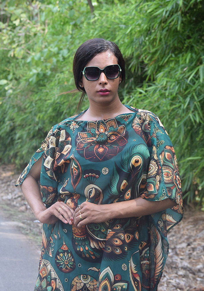 Embark on a journey of cultural splendor with our exquisite Royal Indian Peacocks in a Dark Green Kaftan. This stunning piece of attire celebrates the rich heritage of Indian art, transporting you to an era of majesty and elegance. The classic georgette fabric drapes effortlessly, exuding a light-as-air feel that’s simply divine. Adorned with intricate, handcrafted designs of traditional peacocks, this kaftan is a masterpiece of Indian craftsmanship.