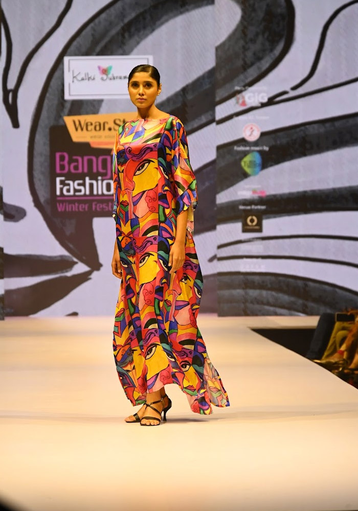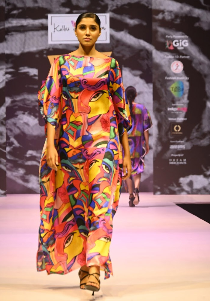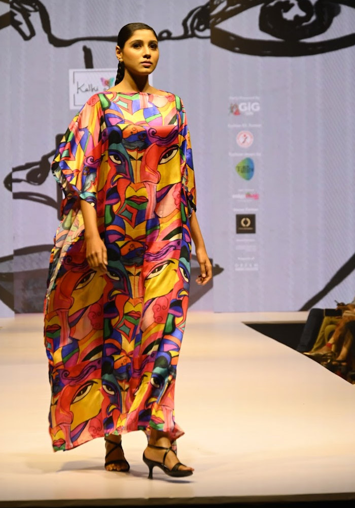 Add a touch of artistic flair to your wardrobe with this stunning Multi Colour Kaftan, featuring the vibrant and modern artwork of Kalki Subramaniam. The flowing design is a masterpiece of beauty, with strokes of colour that seem to dance across the soft satin fabric. This kaftan is not only a statement piece, but also a celebration of femininity and elegance.