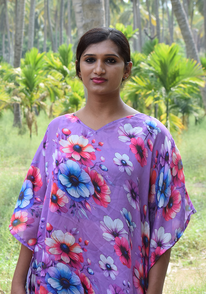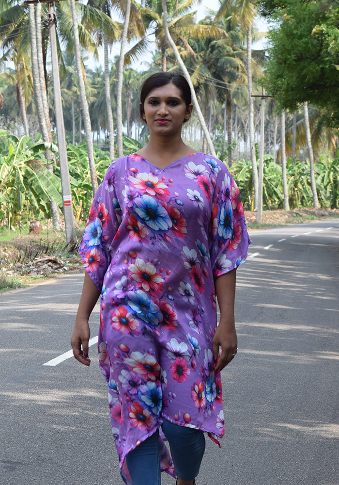 Whether you’re lounging by the beach, attending a casual gathering, or simply running errands, this lavender kaftan is sure to turn heads and make you feel like a queen. Its vibrant floral pattern adds a touch of whimsy and playfulness, making it the perfect addition to your wardrobe.