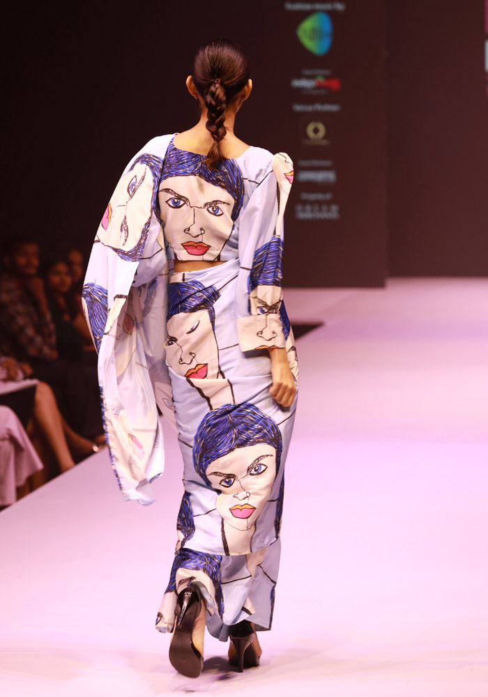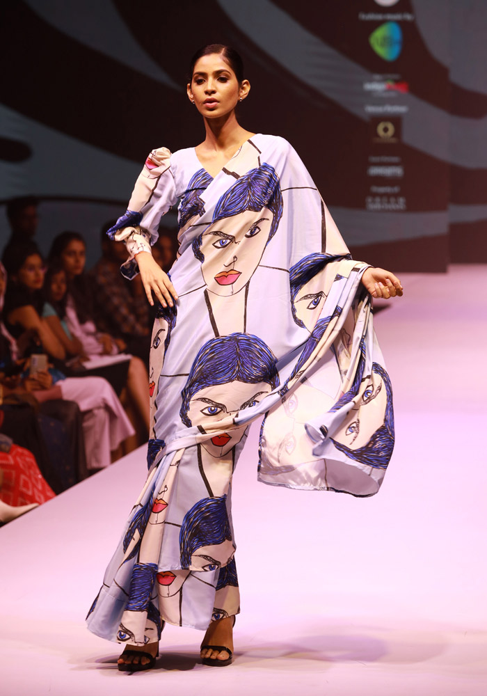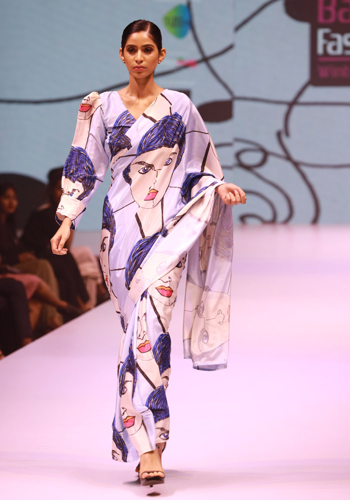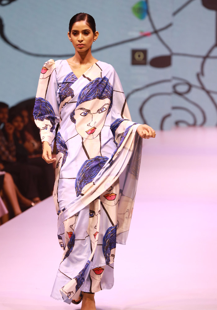 Its modern, it’s chic and it’s for the niche person. This art saree embodies the essence of modernity and boldness. We create statement pieces that make a lasting impression, like our signature blue saree with art print on soft satin.