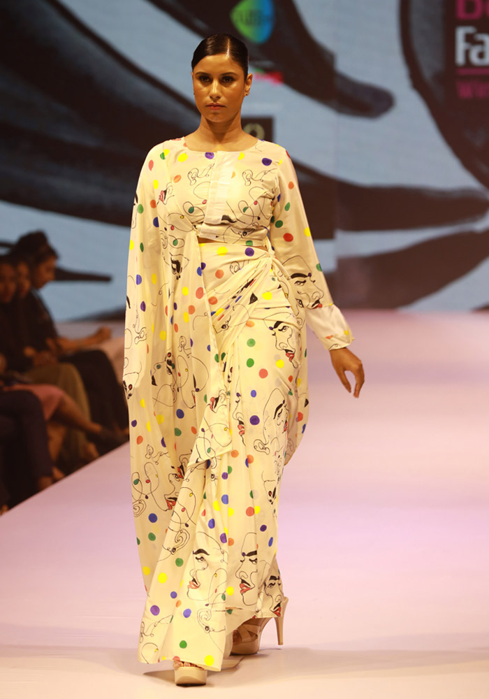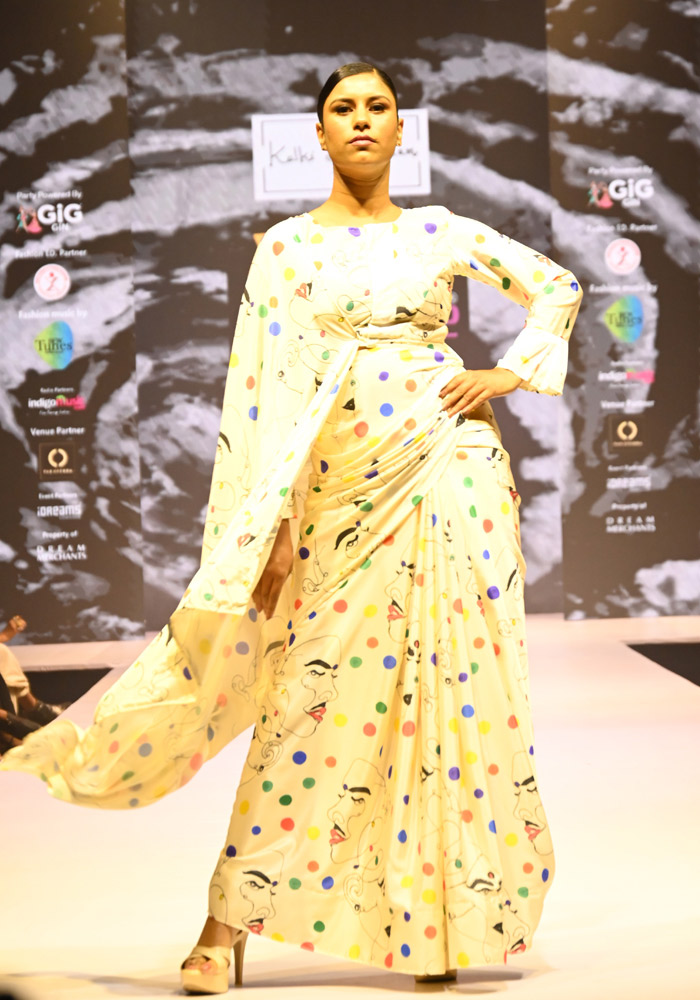 Introducing the Moonlight Muse – a one-of-a-kind, polka dotted saree that exudes sophistication and class. This exquisite piece is designed for the fearlessly individual, who leads the pack with confidence and style. The moon white canvas is adorned with vibrant, multicolored polka dots, adding a touch of whimsy to the overall elegance.