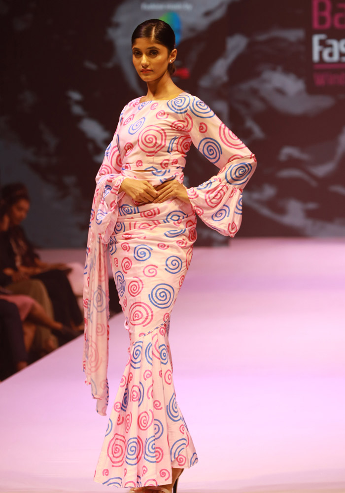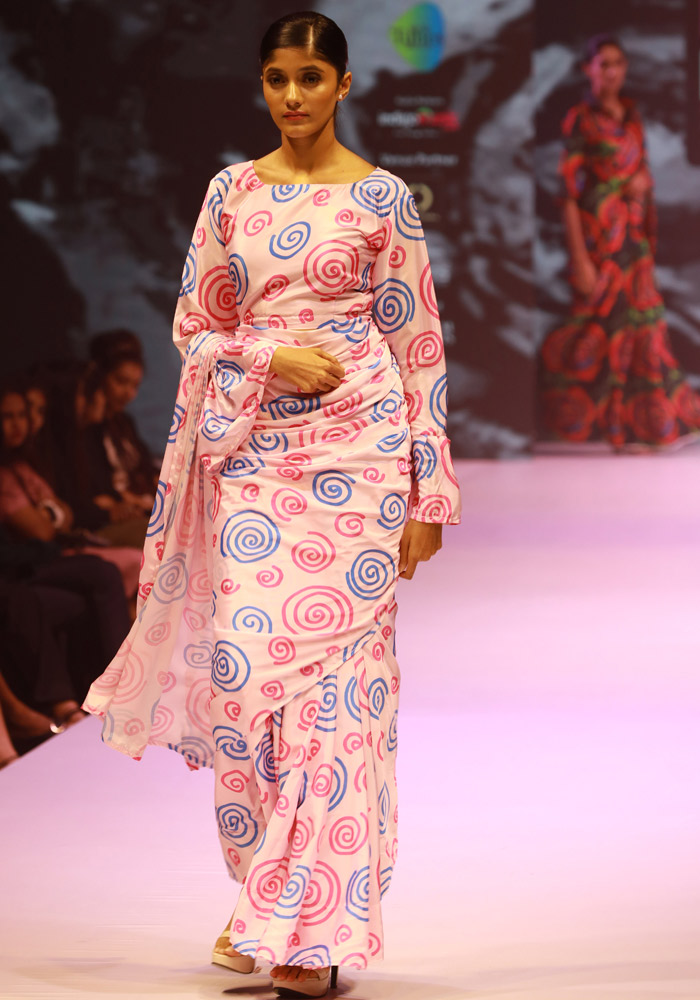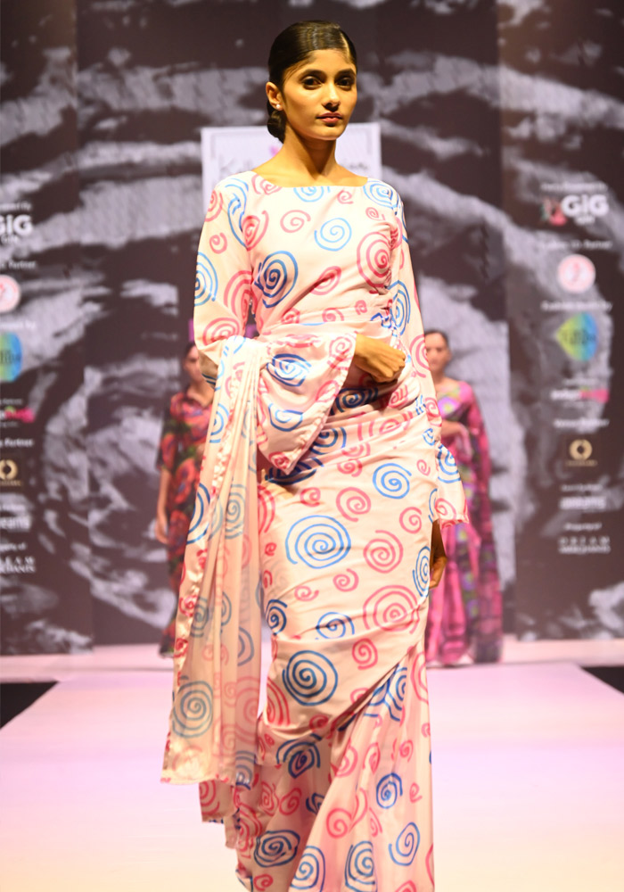 Legance meets nostalgia with our exquisite blue and magenta spirals on a pink saree. This stunning piece of art is not just a garment, but a canvas that weaves together memories and emotions. The intricate spirals dancing across the fabric evoke a sense of timelessness and infinity, reminding us of the sweetest moments cherished in our hearts. Wear a piece of art that tells a story, and make every occasion a celebration of love and beauty.